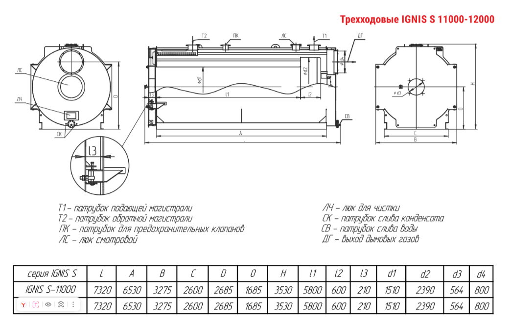Технические характеристики водогрейного трёхходового котла ARCUS IGNIS S-11000